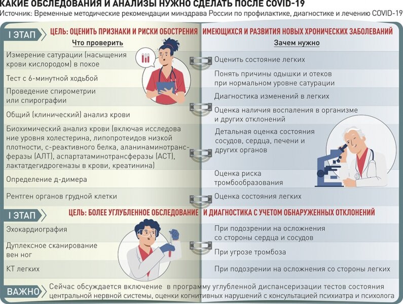 В рекомендациях минздрава говорится, что углубленная диспансеризация проводится через 60 дней после выздоровления. Но на самом деле все зависит от того, как у пациента проходил COVID-19, с какими рекомендациями пациент был выписан из стационара и как он себя чувствует. Многим может потребоваться продолжение приема антикоагулянтов для профилактики тромботических осложнений, значит, понадобится лабораторный контроль за показателями свертывания крови. Если есть проблемы со стороны сердечно-сосудистой системы, легких — понадобится электрокардиография (ЭКГ), эхокардиография, оценка функции внешнего дыхания и уровня сатурации крови кислородом.