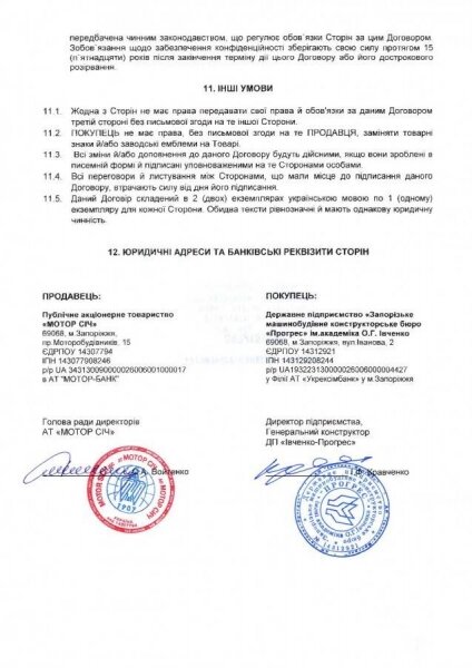 Согласно документу, указанное ЗМКБ «Прогресс» заказало у ПАО «Мотор Сич» продукцию для авиационных турбовинтовых двигателей на общую сумму $7,092 млн или 193,54 млн грн. До конца 2022 года ПАО «Мотор Сич» поставит заказчику 30 комплектов деталей и сборочных единиц двигателя АИ-450С для комплектования двигателей АИ-450Т по $236 тыс. или 6,45 млн грн за комплект. Аванс в 40% должен поступить до 12 ноября 2021 года.