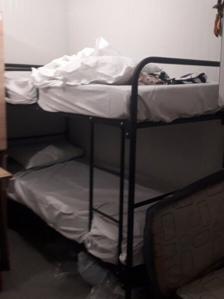 В итоге беженцам ничего не оставалось делать, как смириться. Вагончики для беженцев стоят на голом раскаленном асфальте под открытым солнцем. За день они нагреваются. По ощущениям в комнате было градусов пятьдесят. Мы будто в микроволновке оказались. Окна не спасают ситуацию. В крошечной комнате две двухэтажные кровати и шкафчик с откидным столом. Туалеты и душевые на улице.