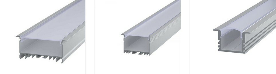 По функциональным способностям профили для светодиодных лент бывают: угловыми, накладными, встраиваемыми, врезными и подвесными.